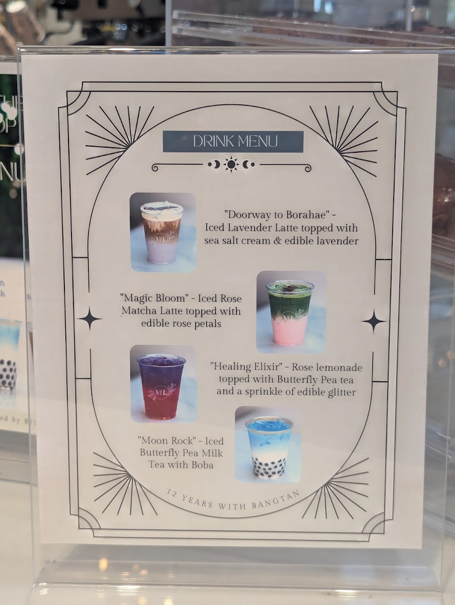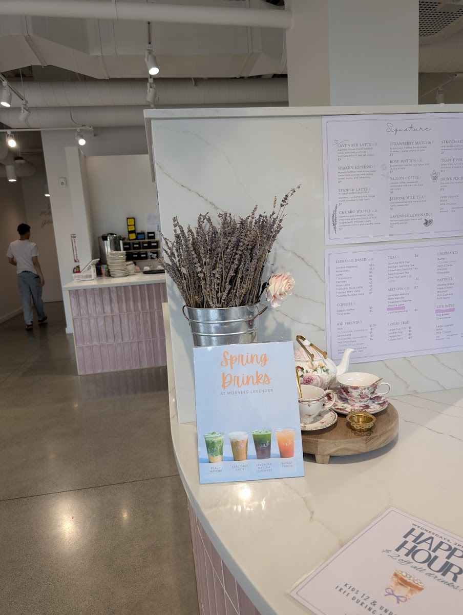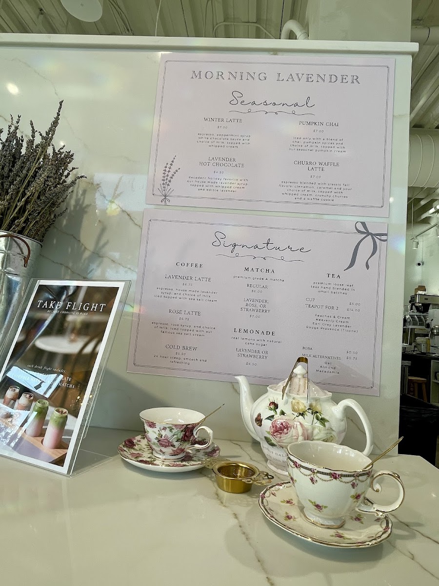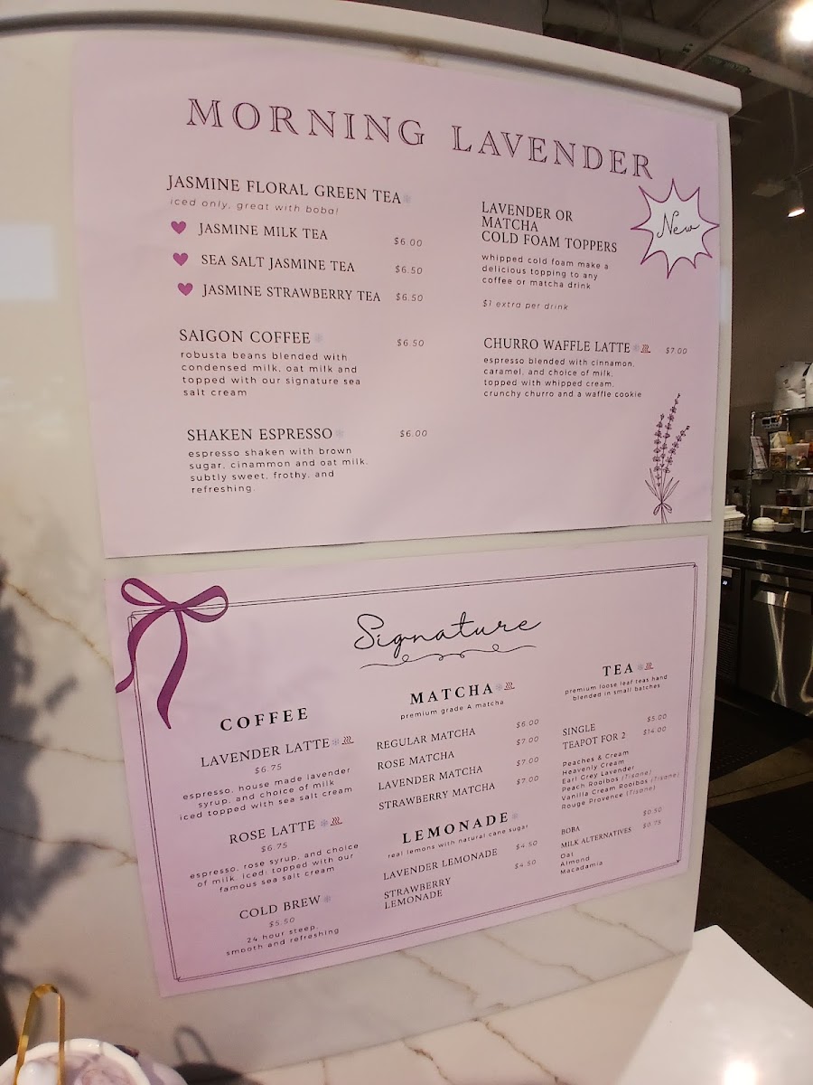 At the heart of the café is the menu, which features a selection of uniquely crafted beverages sure to tantalize your taste buds. Start your day with the Lavender Latte ($6.75), a beautifully balanced drink that has enchanted even the most discerning coffee lovers. Or perhaps indulge in the flower-infused Rose Latte ($6.75), which offers a sweet yet refined taste profile. If you're in the mood for something refreshing, the Lavender Lemonade and Strawberry Lemonade ($4.50 each) are perfect choices, offering a burst of flavor to complement the café’s delightful pastries.